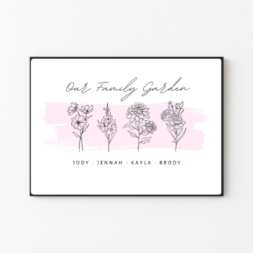 No two prints will be alike, they'll be as unique as your family in terms of the flowers used. Below the floral arrangement are words displaying your family name (example: The Newport Family Bunch and an option to have the line below showing 'growing since 1964.' If you don't want a date included, leave this space blank.